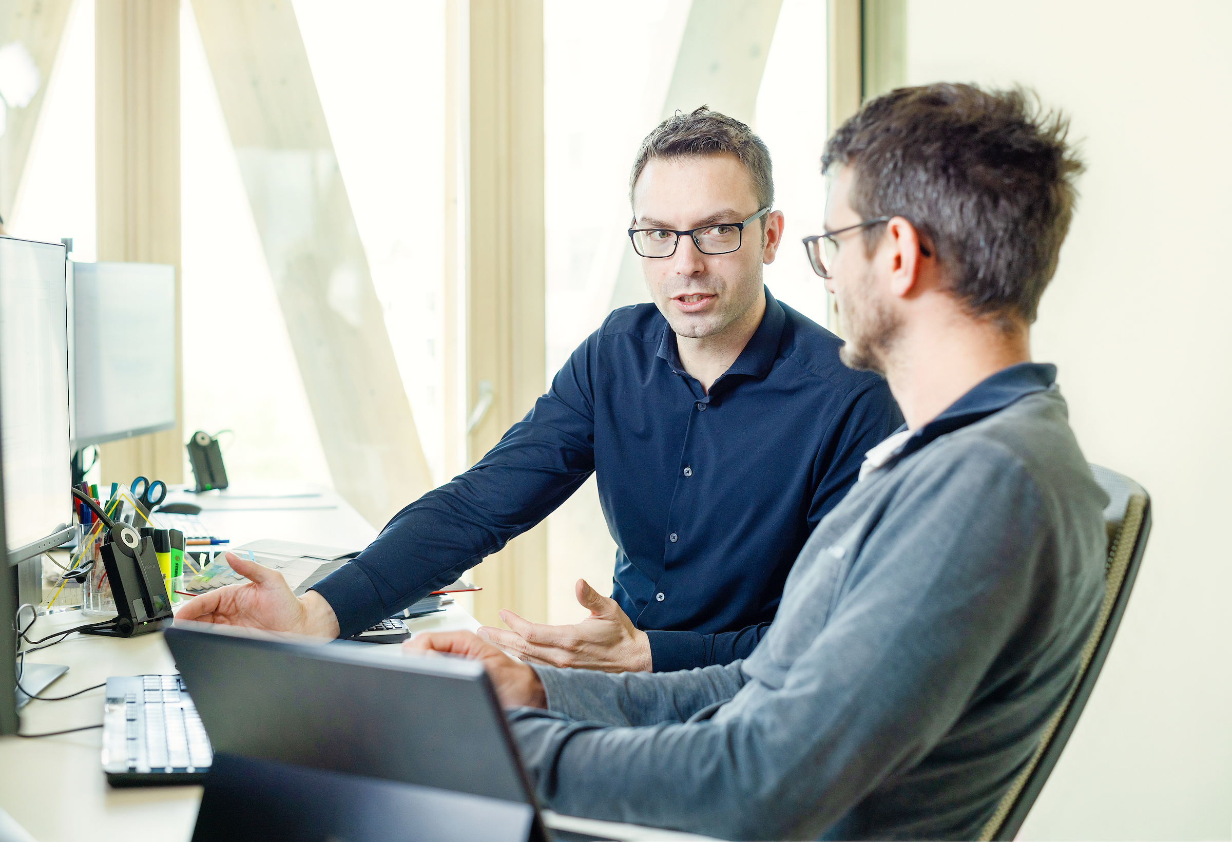 Unser Zuhause auf zwei Etagen eines neuen Holzgebäudes in Dornbirn: temperierte Räume mit viel Platz für Offenheit und angenehme Atmosphäre, für direkte Kommunikation, für Spaß an der Arbeit.