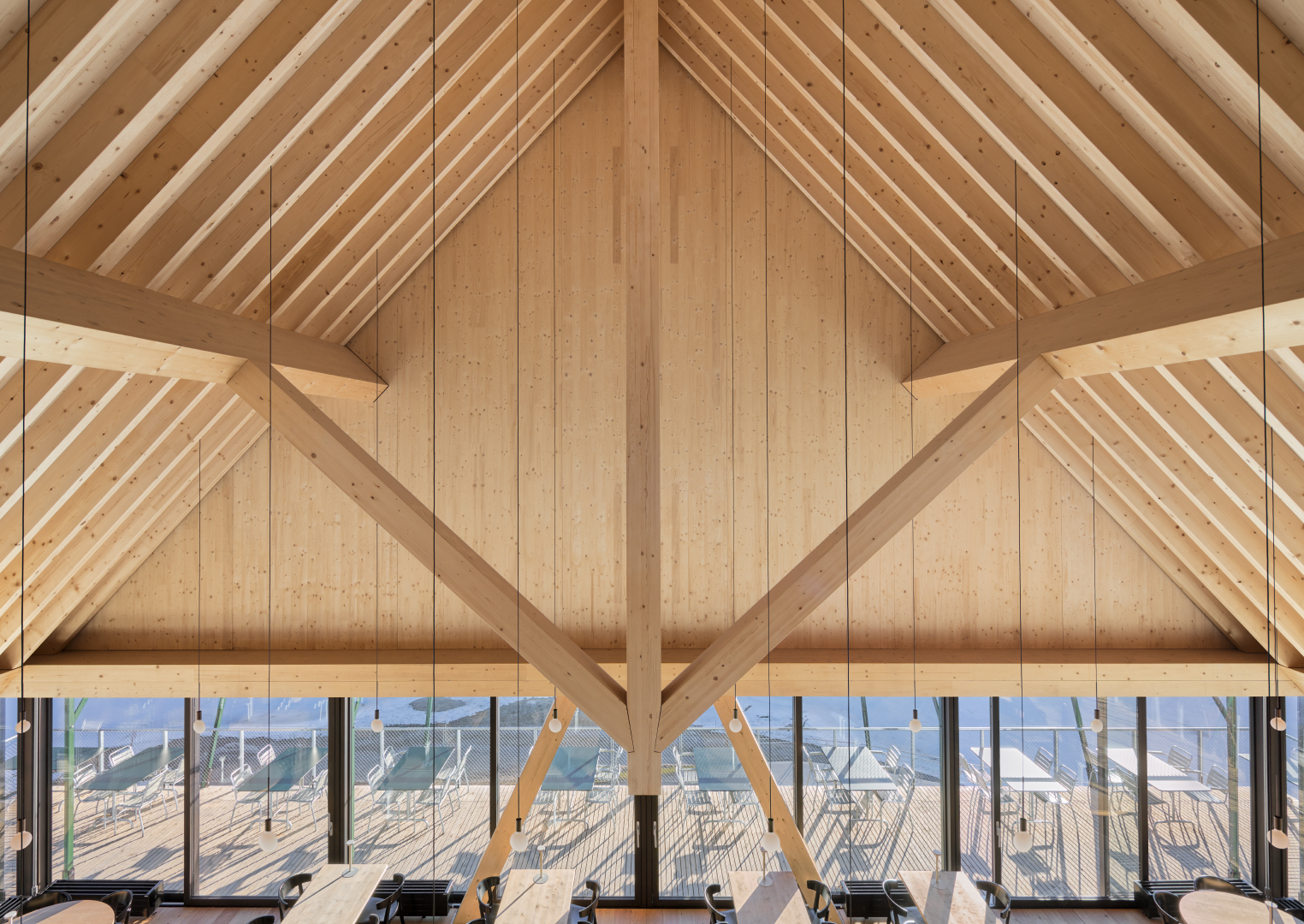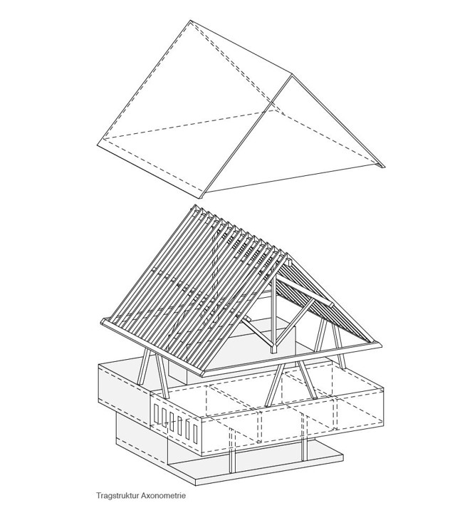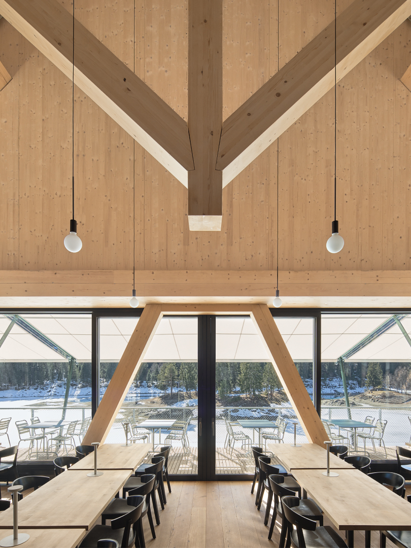 Zur Bewirtung der Winter- und Sommergäste wurde am Caumasee ein neues Haus errichtet mit einem Selbstbedienungsrestaurant für den Sommer, einem Zwischengeschoss für Technik und Lager und einem ganzjährig geöffneten Restaurant im offenen Dachgeschoss. Ein raffiniert entwickeltes Tragwerk ermöglicht einen stützenfreien Raum mit weitem Blick auf See und Berge. Alle erdberührenden Bauteile sind aus Stahlbeton, der Rest ist aus Holz. Das Dachtragwerk ist statisch als Faltwerk ausgebildet. Es besteht aus zwei Hängewerken, die die Lasten in die schrägen, als Scheiben wirkenden Dachflächen ableiten. Diese Dachflächen wiederum sind mit den Stirnwänden statisch verbunden. So kann die gesamte Dachlast über nur vier A-förmige Holzstützen abgetragen werden. Die Holzkonstruktion ist zudem mithilfe verschraubter Verbindungen und lösbar gedübelter Brettstapeldecken reversibel konstruiert. Im Winter wird das großzügig verglaste Selbstbedienungsrestaurant hinter Holzläden verborgen. Durch die auf- und ausklappbaren Bauteile und die weit auskragende Terrasse ist das Haus, obwohl einfach in seiner Formgebung, raffiniert in seinem Erscheinungsbild.